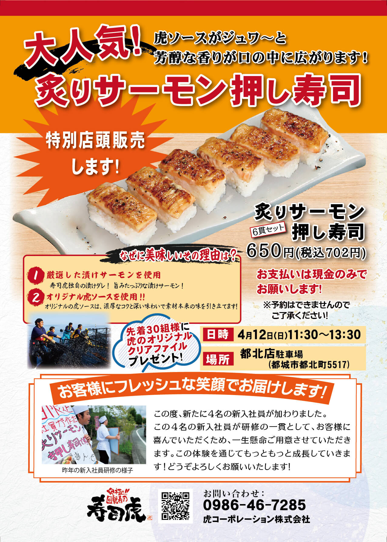 このたび寿司虎では、新入社員研修の一環として「炙りサーモン押し寿司」の特別販売を寿司虎都北店にて実施いたします。 販売当日は、新入社員が一つひとつ丁寧にご用意し、皆さまへお届けいたします。
